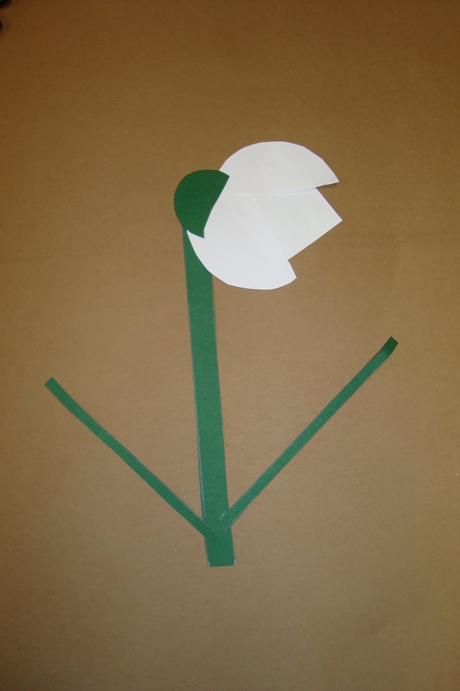 Für den Stiel: Bereite einen grünen 1,5 cm breiten Streifen vor (Stiel) und einen 0,5 x 30 cm breiten Streifen (Blätter). Die Kinder schneiden vom breiten Streifen ein etwa 20 cm langes Stück ab und verwenden es als Stiel. Den dünnen Streifen schneiden sie mittig durch, verwenden beide Hälften als Blätter und kleben sie an den Stiel. Zuletzt befestigen die Kleinen die Blüte am Stiel, und fertig ist das Schneeglöckchen