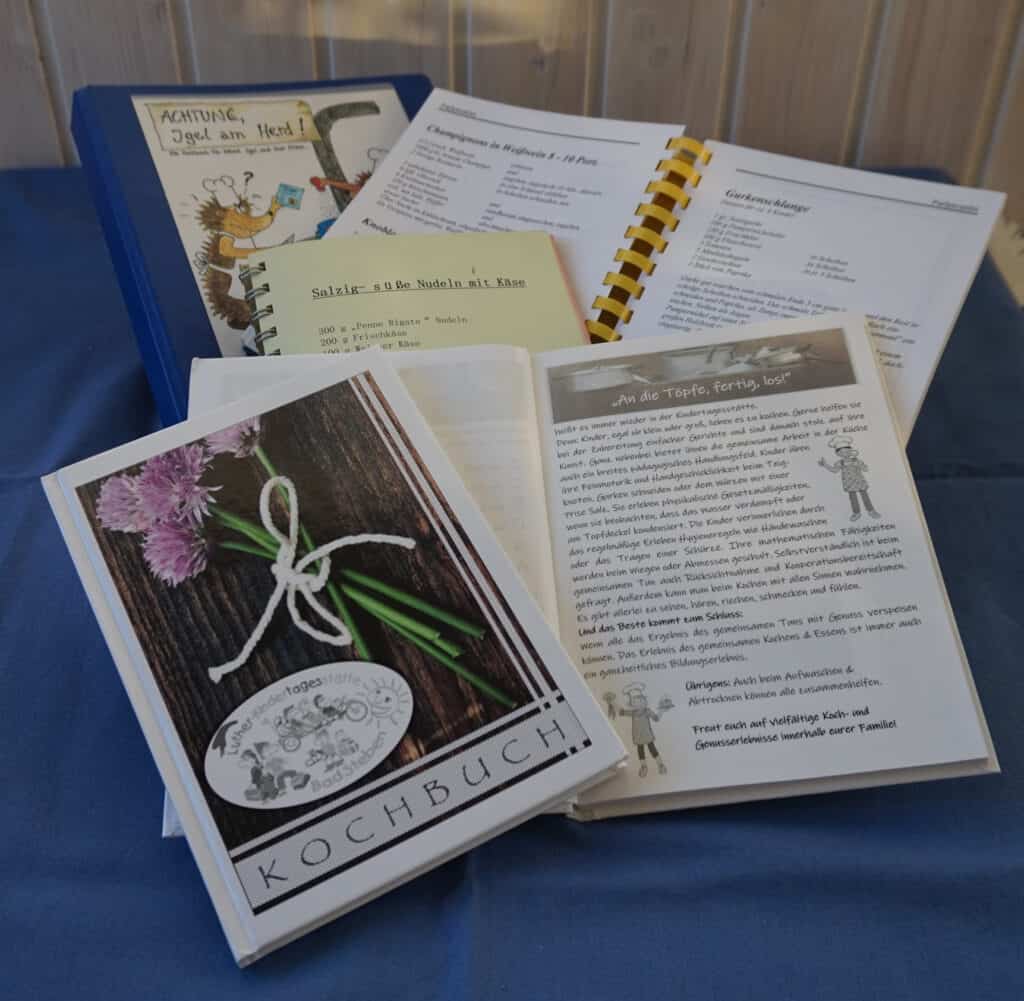 In jeder Kita wird gekocht, gebacken oder ein leckeres Getränk hergestellt. Bei all den Kochabenteuern in der Kita lohnt es natürlich, die Rezepte zu sammeln. Sie können den Eltern zugänglich gemacht oder mit vielen Bildern als Kochkarten für die Kinder aufbereitet werden. Ebenso ist die Idee eines eigenen Kochbuchs für die Kita naheliegend. Ein Kochbuch für die Kita stellt gerade am Ende der Kita-Zeit ein wunderbares Abschiedsgeschenk dar, in dem die Kinder auch noch Jahre später in Erinnerungen schwelgen können.