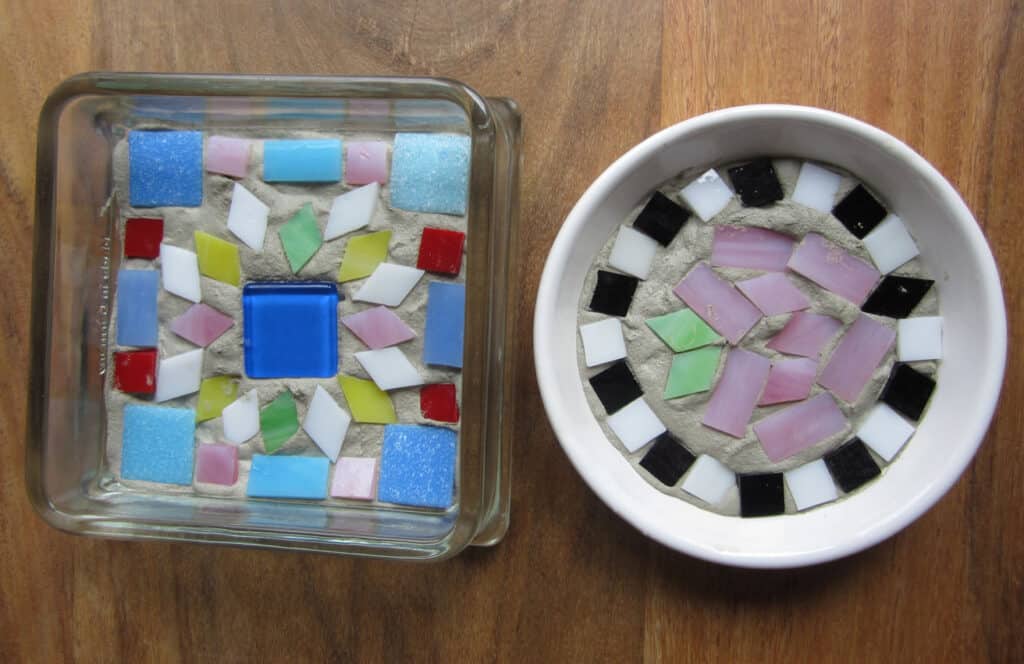 Die Kinder drücken sie nach Lust und Laune vorsichtig in den Fliesenkleber und kreieren ihr eigenes Mosaik. Dabei müssen sie gut aufpassen, dass sich die Fliesen nicht überlappen und auch nicht zu tief in die Masse gedrückt werden.