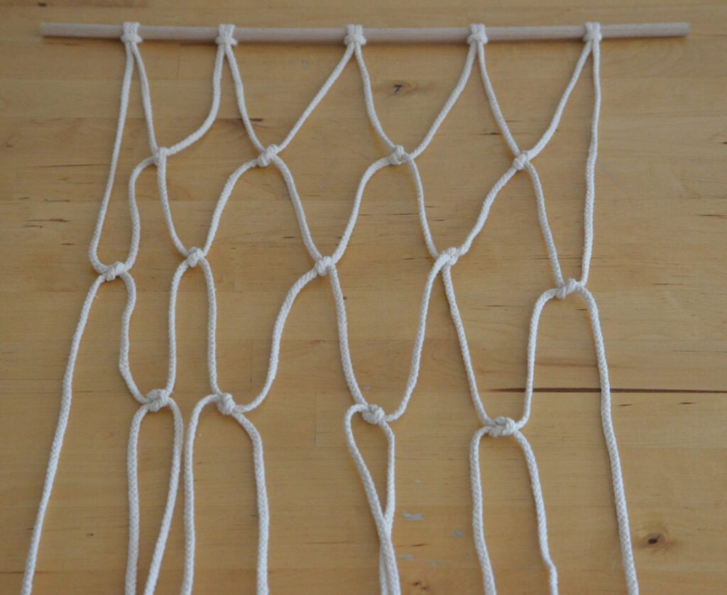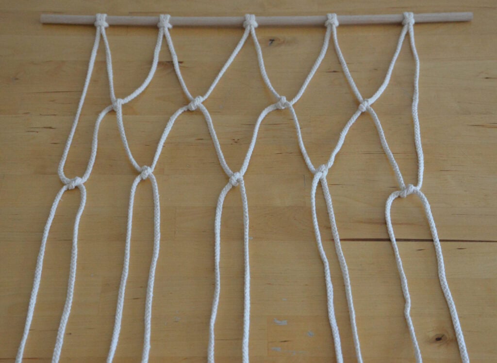 Dann werden die einzelnen Fäden so miteinander verknotet, dass nach und nach ein Rautenmuster entsteht. So sieht das Muster nach einer Weile aus.