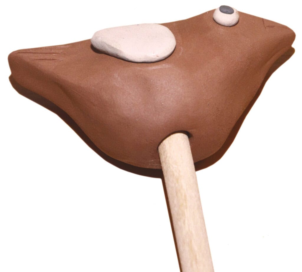 Die Kinder erhalten ein Stück Ton, das gut in ihre Hand passen sollte. Der Ton wird nun mehrmals auf das Holzbrettchen geschlagen, um Lufteinschlüsse zu beseitigen. Danach rollen sie aus ihrem Tonstück eine Kugel. Aus dieser wird mit Daumen und Zeigefinger ein Vogelkörper modelliert. Nun wird Ton in weiteren Farbtönen zum Modellieren vorbereitet. Aus diesem formen die Kinder Flügel und Augen für ihren Vogel. Kleinere Details können eingeritzt werden. Zum Schluss den fertigen Vogel unten mit einem Rundholz anbohren. Dieses wird nach dem Trocknen hineingesteckt und mit etwas Heißkleber von der Fachkraft fixiert.
