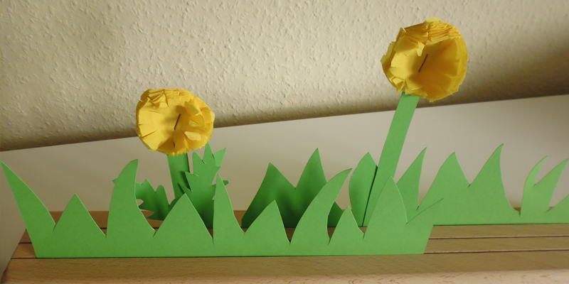 Zunächst schneiden die Kinder eine grüne Wiese in der Länge der Erzählschiene aus und stellen diese in die erste Rille. Danach gestalten sie eine Löwenzahnpflanze mit gelber Blüte, eine Pusteblume sowie den Samen einer Pusteblume aus dem Fotokarton. Dem Text entsprechend werden nacheinander die einzelnen Elemente in die Erzählschiene gesteckt.