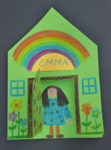 Im zweiten Schritt die Tür auf dem oben liegenden Fotokarton ausschneiden, abgesehen von der gestrichelten Falzlinie. Im nächsten Schritt das Namensschild aus einem Stück Fotokarton schneiden und über die Türöffnung kleben. Die Kinder schreiben ihren Namen in das Schild. Hierbei hilft gegebenenfalls die Erzieherin/der Erzieher.